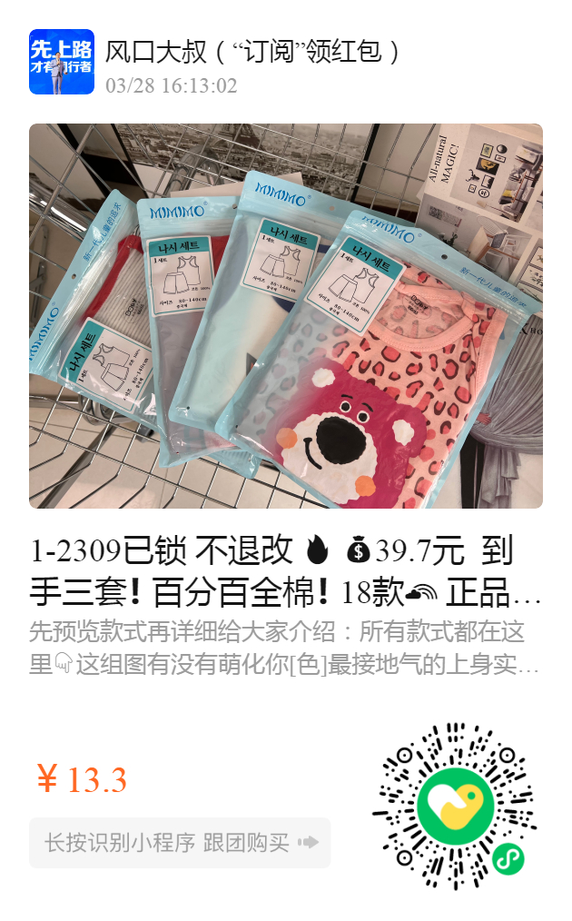 1-2309已锁 不退改 39.7元 到手三套❗️ 百分百全棉❗️ 18款 正品mimimo儿童背心套装❗️ 工厂亏本清仓甩货。答应我,让我们背心套装的清凉陪伴孩子们一整个夏天🥤️ 韩国都有专柜的童装品牌。外贸大厂人家也是出手大方今天给的价格更是让人激动! DLL-1