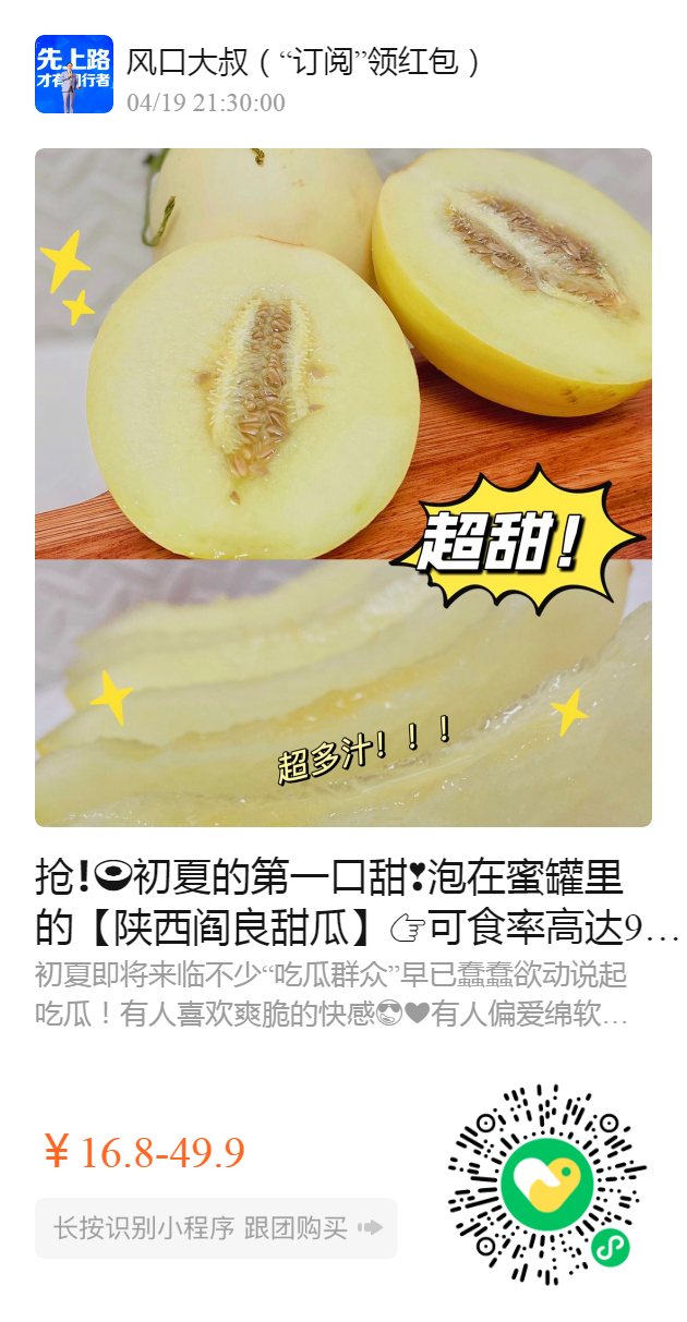 抢❗ 🍈初夏的第一口甜❣️泡在蜜罐里的【陕西阎良甜瓜】 可食率高达98%,好吃到成为地标性水果 纯天然的爆汁甜蜜。果皮只有薄薄一层饱满丰厚的果肉上挂满丰盈的汁水.晶莹透亮犹如美玉一般。不愧玉琥珀之名!