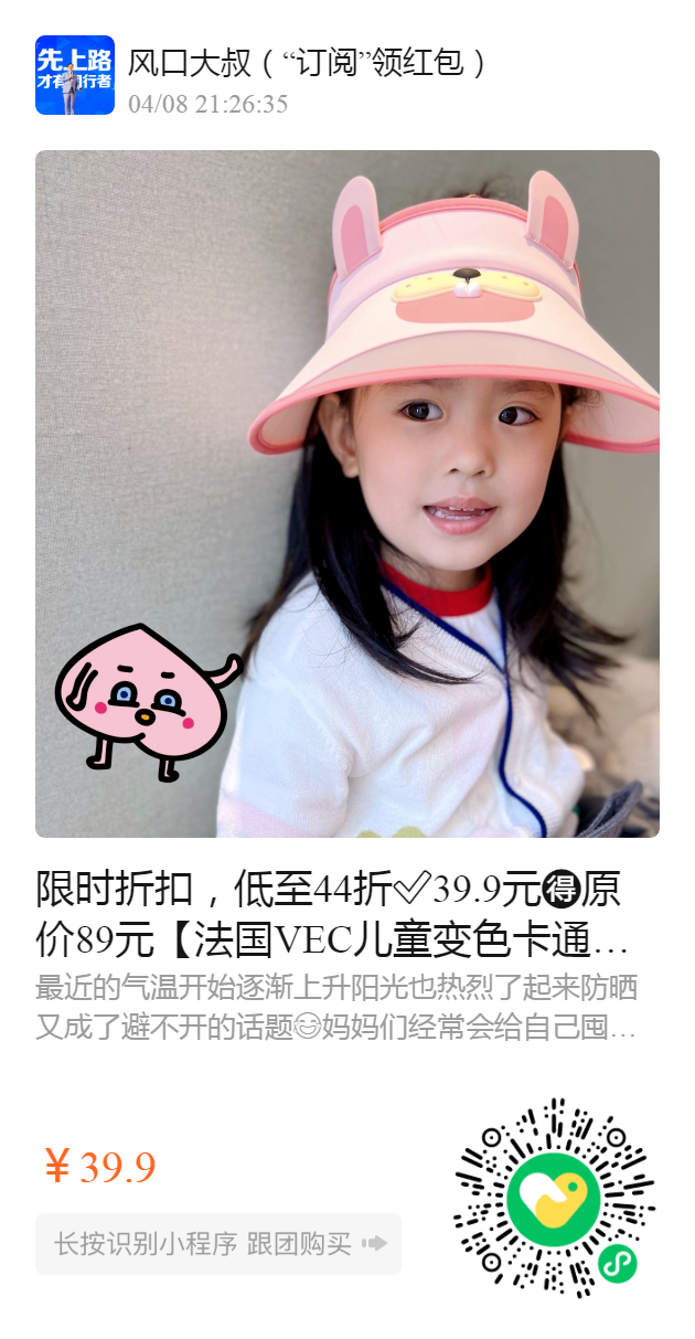限时折扣,低至44折✅39.9元原价89元【法国VEC儿童变色卡通遮阳帽】1顶戴几年,亲子户外必备~🥳 大面积防晒保护🌞空顶设计透气不闷️UPF50+全波段防晒‼️防丢失挂绳设计🤩风吹也不怕丢出门撒欢再也不怕娃晒黑了