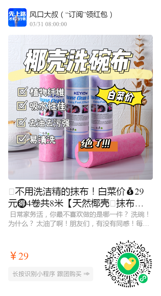 🥬不用洗洁精的抹布!白菜价29元️4卷共8米【天然椰壳🥥抹布】超高性价比!可重复使用 敲划算,敲省钱,好用不贵! 一定要多团点❗️ ✅面料柔软不易变硬,强力去污,一冲即净 ✅超强吸水,干湿两用 ✅不掉毛,不滋生细菌! 一款颜值与实力并存的抹布 💯推荐给你们❗️