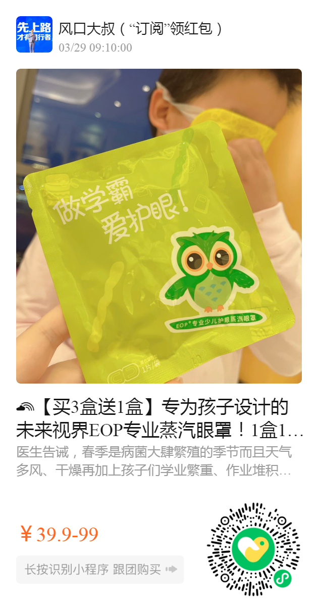 【买3盒送1盒】专为孩子设计的未来视界EOP专业蒸汽眼罩!1盒10片39.9!限量3盒送1盒,4盒99!一片只要2.4元啊!