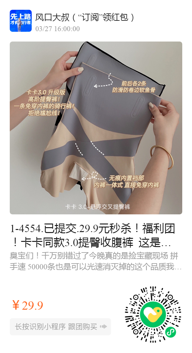 1-4554.已提交.29.9元秒杀!福利团!卡卡同款3.0提臀收腹裤 这是一条会吃肉的瘦身裤!即穿即瘦!紧致提臀收腹 ! 一件=无痕内裤+收腹提臀裤+安全裤+可外穿骑行裤!别人卖𝟭𝟵𝟴一条!今天直接一杯奶茶的钱换一副好身材!