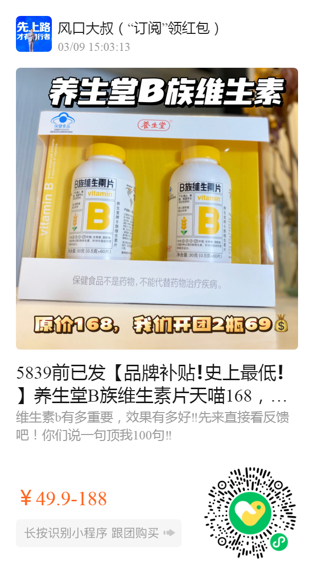5839前已发【品牌补贴❗️史上最低❗️】养生堂B族维生素片天喵168,咱们福利开团加量版2罐一共120片,69两瓶!麻溜囤