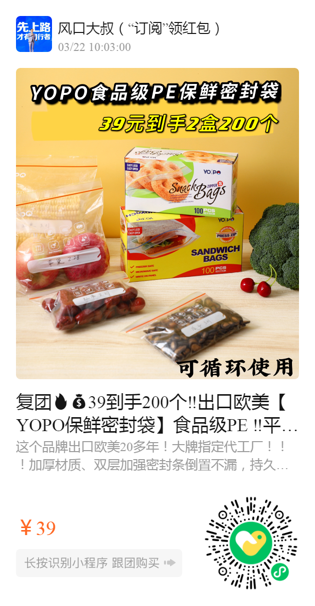 复团39到手200个‼️出口欧美【YOPO保鲜密封袋】食品级PE ‼️平均一个不到2毛钱! 🉑️循环使用,万物皆可装,耐低温 咬入式夹链封口设计咔咔一下轻松密封,密封效果超优秀💯冷藏冷冻🧊防潮,保鲜,防串味锁住美味,轻松享受新鲜生活,杂粮干货随心放,秒变真空延长保质期!