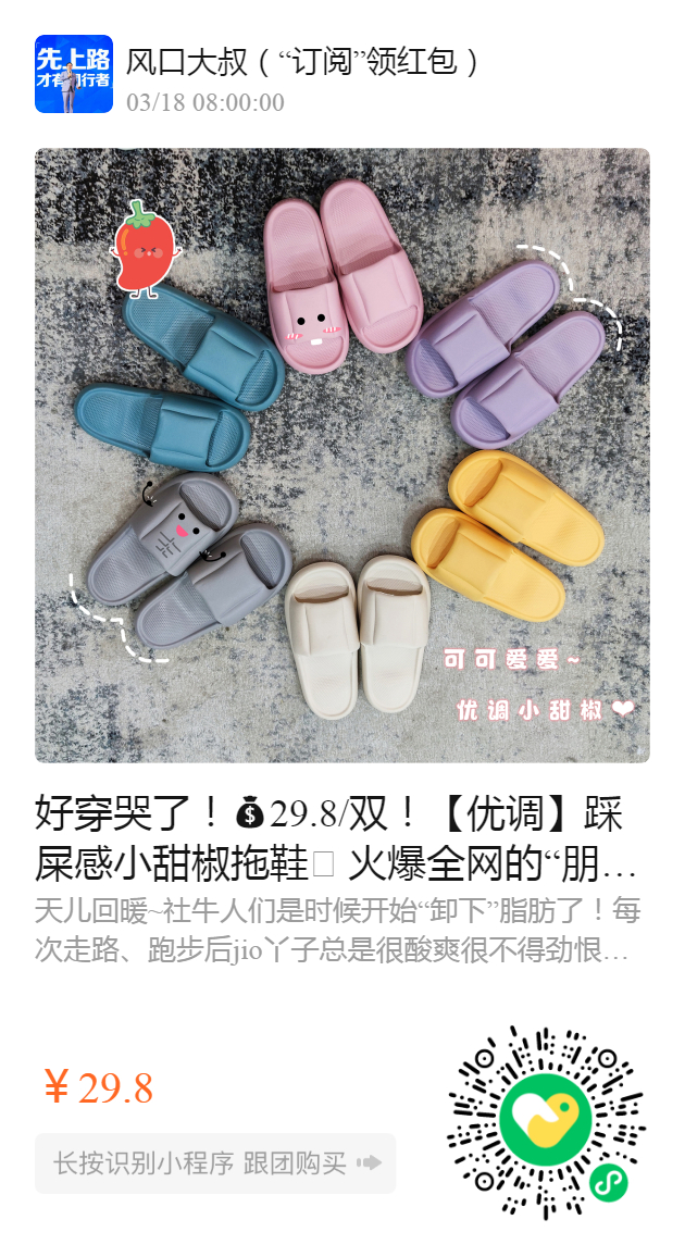 好穿哭了!29.8/双!【优调】踩屎感小甜椒拖鞋🌶️ 火爆全网的“朋克”养生🧘 沙丘按摩鞋床yyds!散步穿它真的爽呆,当代养生潮牛必备! 旗舰店39.8!团购价仅需29.8! 一定要把全家都安排上,尺码正。