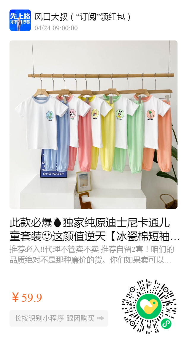 此款必爆独家纯原迪士尼卡通儿童套装这颜值逆天【冰瓷棉短袖T➕棉麻防蚊裤】 颜值控麻麻必入!不仅仅是颜值高~品质非常棒!推荐咱家老粉代理都给孩子留2套!! 流行的马卡龙撞色搭配🥰迪士尼卡通图案 没有孩子不喜欢!男女宝宝都可穿~ 青岛迪士尼代工厂订单品质吊打微商爆款