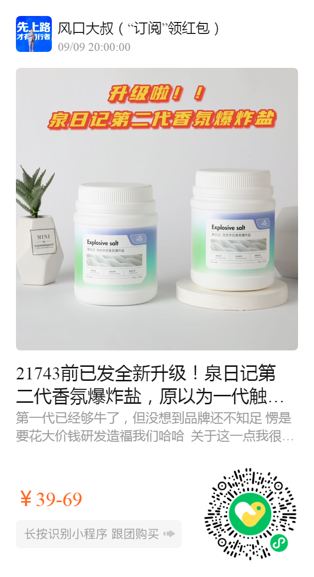 21743前已发全新升级!泉日记第二代香氛爆炸盐,原以为一代触及天花板了,没想到二代更绝!添加了高级香氛,加速氧化污渍!味道更好闻✔️颗粒更细腻✔️清洁更有效🏻