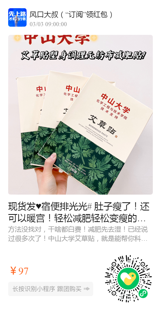 现货发️宿便排光光# 肚子瘦了!还可以暖宫!轻松减肥轻松变瘦的!专业的事情交给有文化的组织来!中山大学艾草贴塑身调理无纺布减肥贴!轻松减肥,男女通用!5盒一个疗程只要99元!给自己一个机会瘦下来!中山大学艾草贴,就是能帮你科学去湿排毒,减肥先去湿!