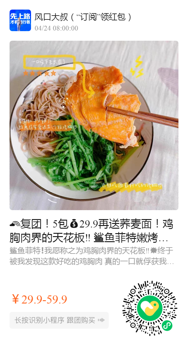 复团!5包29.9再送荞麦面!鸡胸肉界的天花板‼️ 鲨鱼菲特嫩烤鸡小胸肉新品🥓