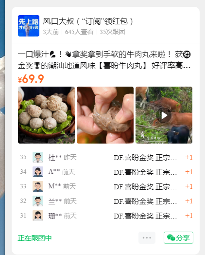 一口爆汁!拿奖拿到手软的牛肉丸来啦! 获️金奖的潮汕地道风味【喜盼牛肉丸】 好评率高达99% 吃过的潮汕人都都称赞它:💯💯正宗 吃起来脆爽多汁,口感丰满,真的爆赞! 淀粉≤1%,️防腐剂,️香精,真手打,纯牛肉❗️超劲道❗️ 原价128,今天开团只要69元/3️⃣袋,牛肉丸牛筋丸任选~