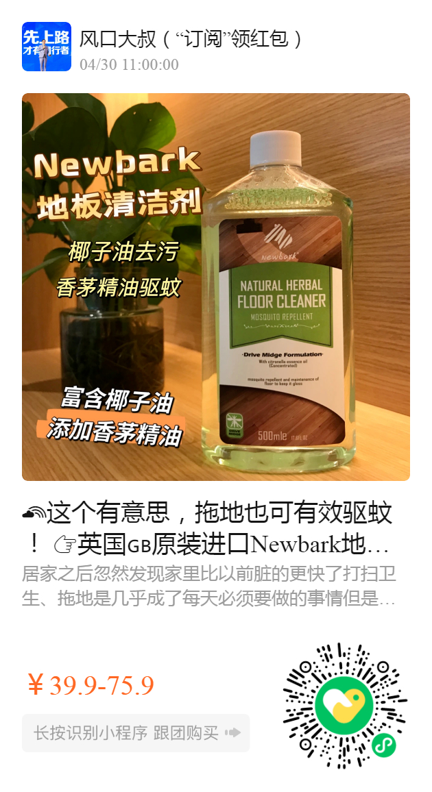 这个有意思,拖地也可有效驱蚊! 英国原装进口Newbark地板清洁剂(还有驱蚊功效噢!)富含椰子油,添加香茅精油、艾叶精油、温和杀菌和光亮成分,去污驱蚊无毒害「孕妇、婴儿、宠物皆可用」