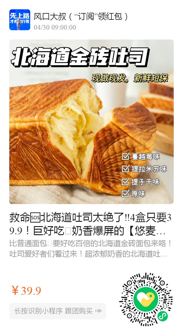 救命🆘北海道吐司太绝了‼️4盒只要39.9! 巨好吃🤤奶香爆屏的【悠麦主义-北海道金砖面包】匠心专选精制面粉手工制作,层层香甜~健康营养无“腹”担!四种口味😋松软绵密,奶香浓郁,老少皆宜! 开袋即食,非常适合没时间吃早饭的学生党和上班族,冲冲冲!!!