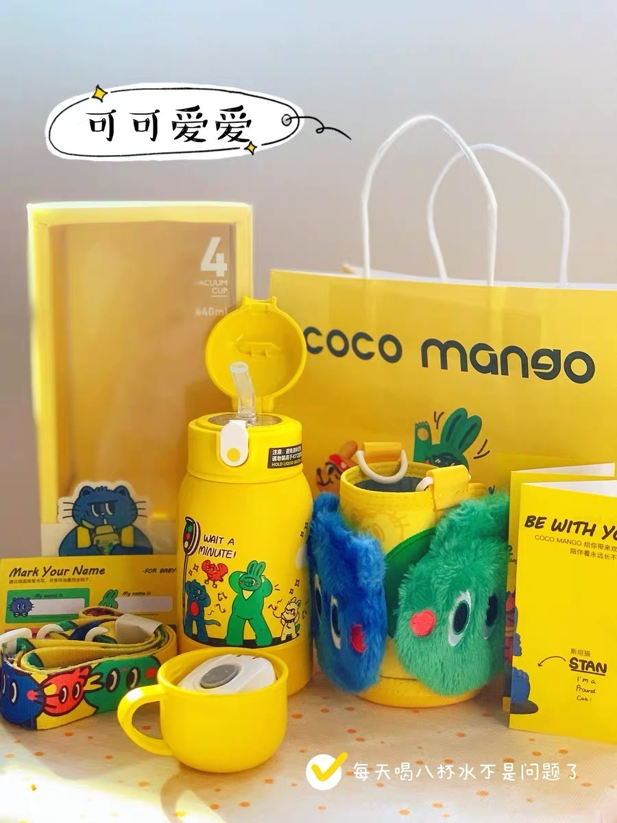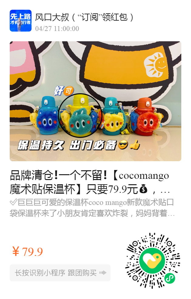 品牌清仓❗一个不留❗【cocomango 魔术贴保温杯】只要79.9元,旗舰店229元【羊毛团】 赶紧囤货这么可爱怎么会有人能忍住不买🤣 魔术贴保温杯🤣这设计谁想出来的⁉️ 一杯双盖🉑替换 保温保冷24小时以上 四种颜色 ️红黄蓝绿 都是礼盒装 送人自用都体面