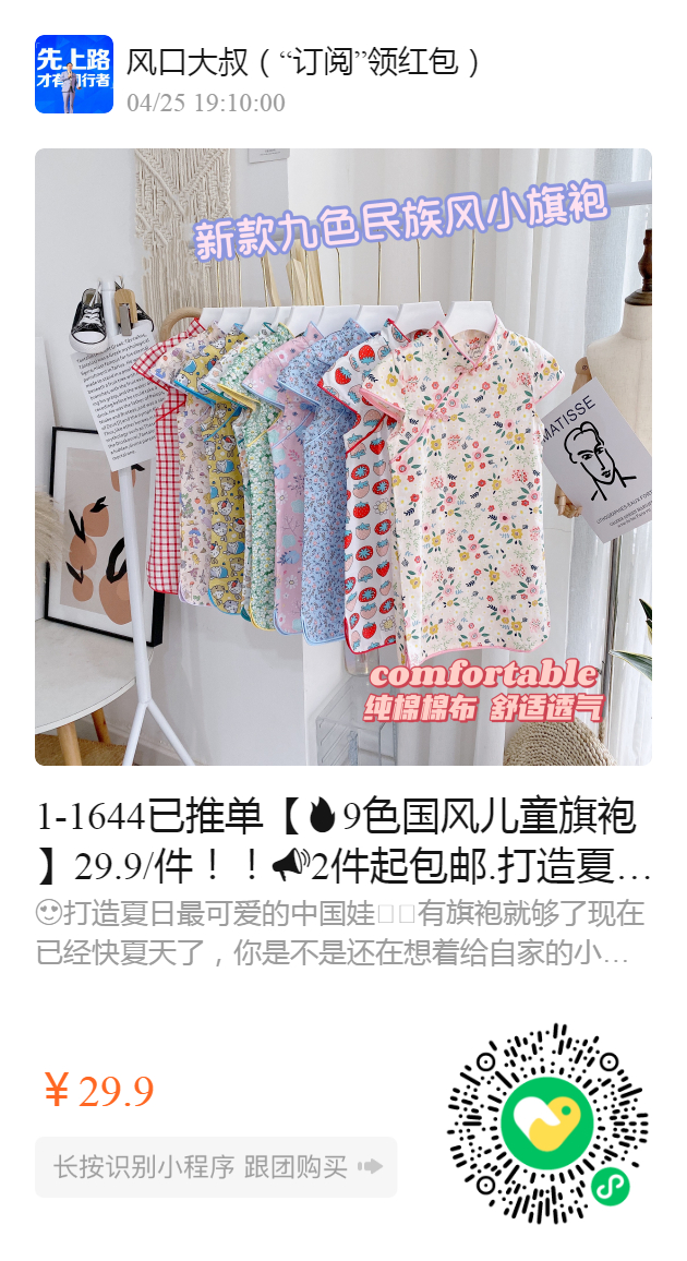 1-1644已推单【9色国风儿童旗袍】29.9/件!!2件起包邮. 打造夏日最可爱的中国娃娃~有旗袍就够啦!! 纯棉材质,超级柔软,薄薄的面料太适合夏天啦~强烈推荐自留款️ 这个夏天必须给宝贝安排上!7