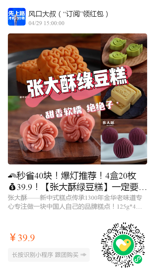 秒省40块!爆灯推荐!4盒20枚39.9!【张大酥绿豆糕】一定要buy!旗舰店4盒79.9!细腻绵润,绿豆清香诱人,口口都是满足感❗❗1盒5个口味!传承1300年!