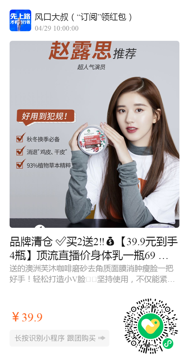 顶流直播价身体乳一瓶69 两瓶98元/面膜一瓶108元