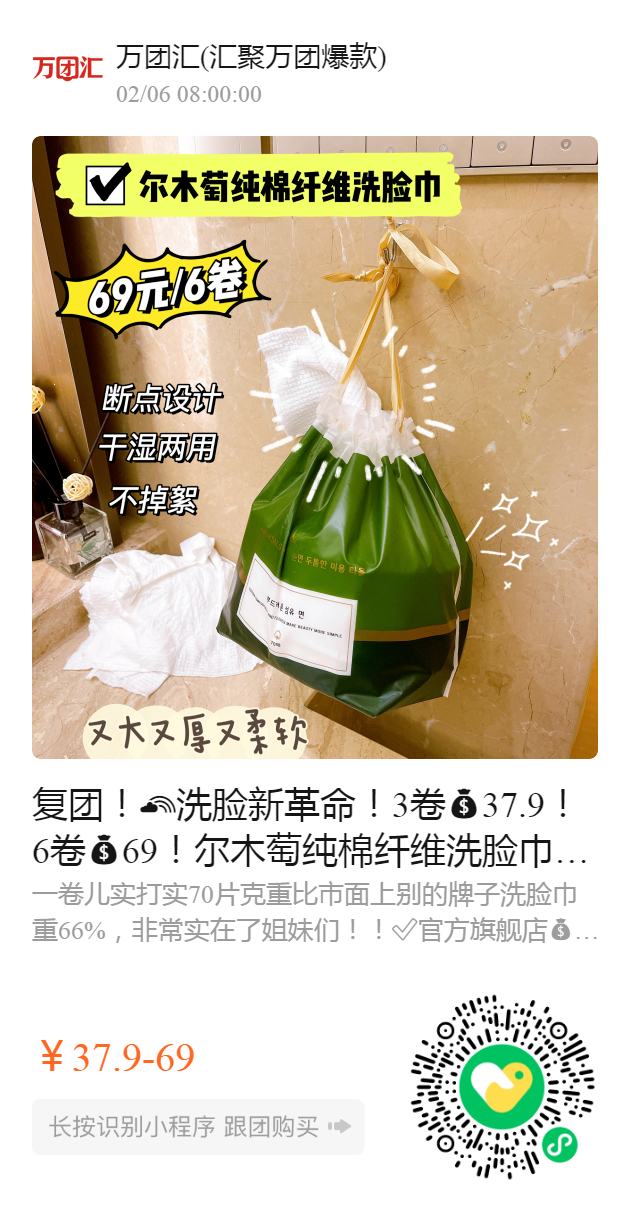 复团!洗脸新革命!3卷37.9!6卷69!尔木萄纯棉纤维洗脸巾(一卷70张),这么划算的尔木萄洗脸巾你们感受下!