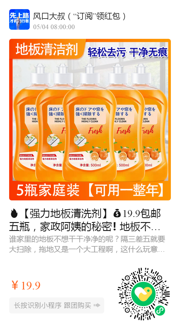 【强力地板清洗剂】19.9包邮五瓶,家政阿姨的秘密❗️ 地板不再黏乎乎,香橙味➕ 樱花味!开抢啦,清洁+保养 清洁必备神器!️宠物与小孩的家庭放心使用,拖地不留水印,光亮如新,厨房厕所的水垢黄渍都能擦得干干净净!性价比无敌~~