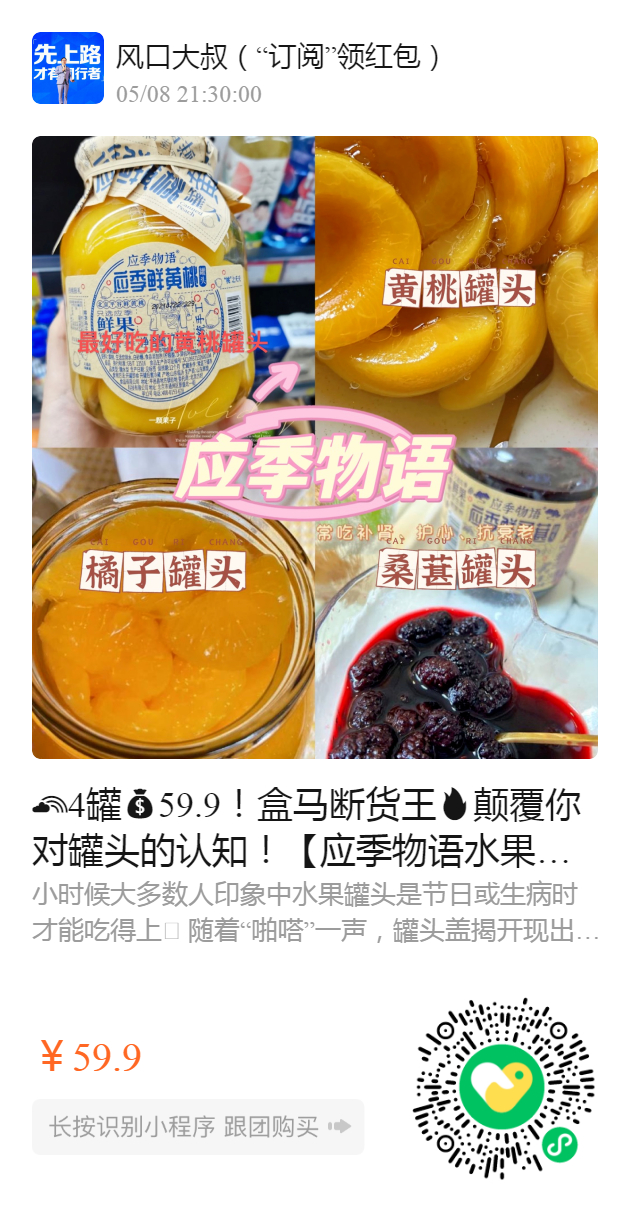 4罐59.9!盒马断货王颠覆你对罐头的认知!【应季物语水果罐头390g】🍑罐头从我这里开始不会再是不健康的代表‼️配料简单💖原材料应季新鲜传统手工艺制作️ 孕妇、小孩都能放心畅吃‼️