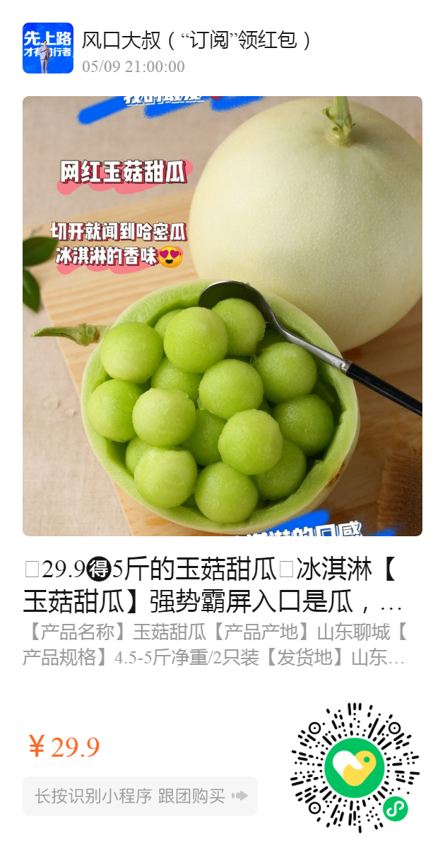 🧧29.9️5斤的玉菇甜瓜🧧 冰淇淋【玉菇甜瓜】强势霸屏 入口是瓜,却相当的丝滑甜蜜,都说它是行走的冰淇淋! 果肉翠绿色,超级漂亮! 入口即化!软糯香甜! 不仅美味多汁,而且糯沙香甜 冷藏后,犹如冰淇淋的口感 不说了️,她已经俘获了我的心。。。