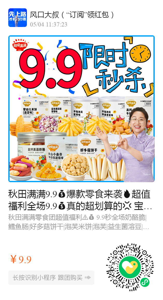 秋田满满9.9爆款零食来袭超值福利全场9.9真的超划算的 宝宝的最爱,数量有限赶紧开抢 超多款式可选️奶酪脆|鳕鱼肠|好多菇饼干|泡芙米饼|泡芙|益生菌溶豆|小软饼…💥赶紧来挑~都是9.9 宝宝就爱这一口😋下单秒发货️妈妈们赶紧囤起来‼️
