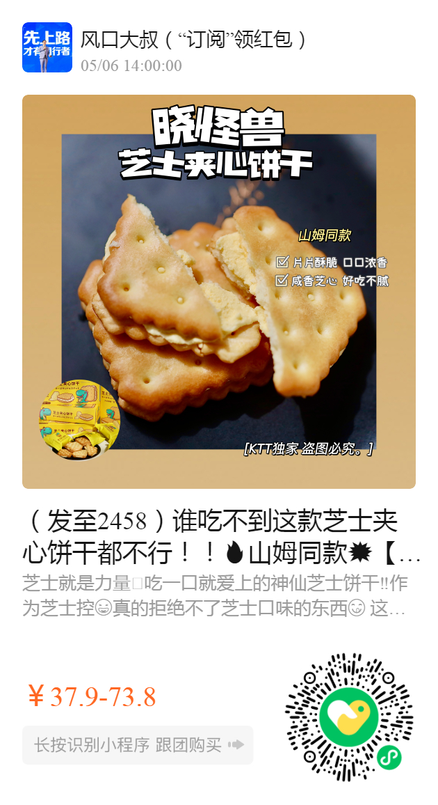 (发至2458)谁吃不到这款芝士夹心饼干都不行!! 山姆同款💥【晓怪兽芝士夹心饼干 】 37.9到手4盒‼️好吃到飞起😆的芝士饼干 🍪咸香酥脆 满满芝士🧀一口下去 口感层次超丰富👅芝士醇厚细腻 奶香浓郁咸味适中真的爱不释口️ 芝士爱好者闭眼入‼️🥳