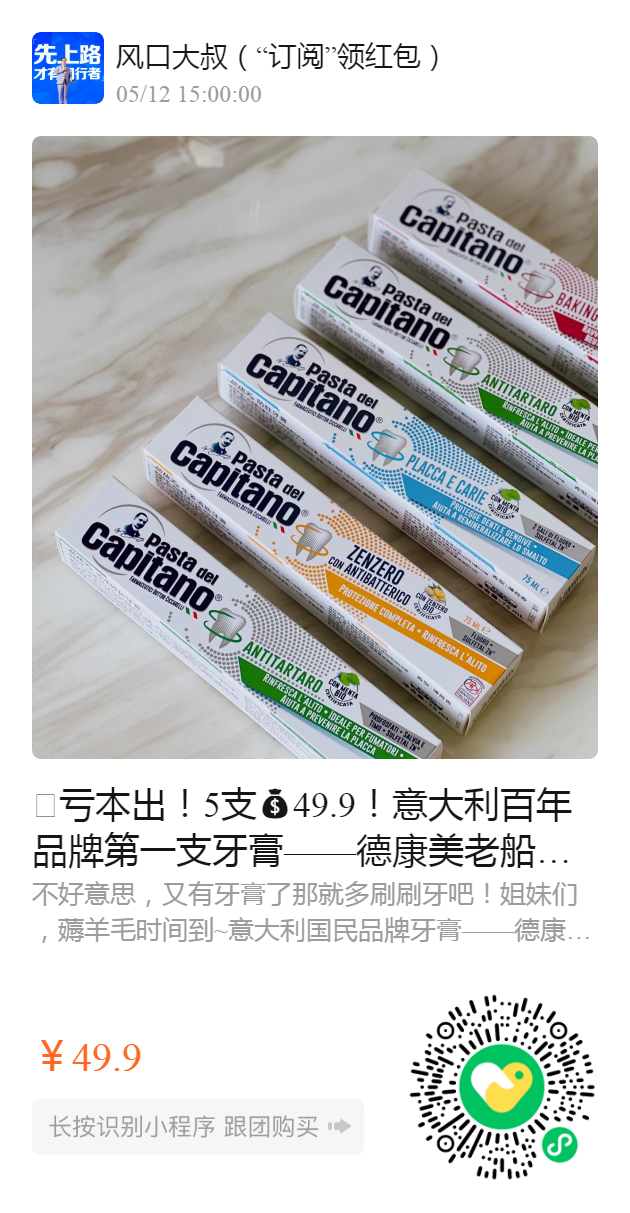 🥬亏本出!5支49.9!意大利百年品牌第一支牙膏——德康美老船长牙膏!英国女王伊丽莎白二世御用品牌 ,安全无添加,官网在售 39元/支,国内总代调整亏本出!