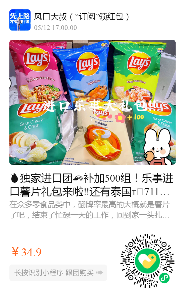 独家进口团补加500组!乐事进口薯片礼包来啦‼️还有泰国🇹🇭711最新上市的爆款——乐事咸蛋黄薯片【泰式色拉味/鱿鱼味/酥脆大虾味/咸蛋黄味/洋葱味】平均一袋*要5.8 结束了忙碌一天的工作🏻回到家一头扎进松软的沙发,随手拿出一包薯片,看着电视。全身得到放松