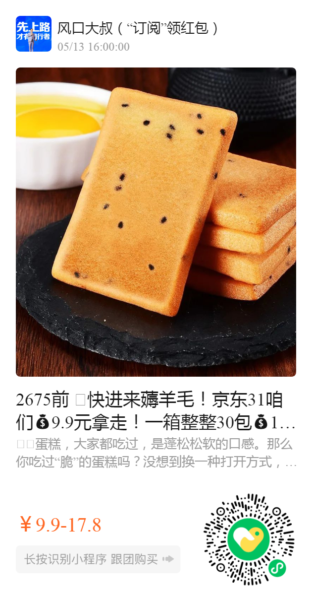 2675前 🤩快进来薅羊毛!京东31咱们9.9元拿走!一箱整整30包17.8元两箱整整60包‼️太宝藏了这个干烙脆蛋糕!咬一口是那种嘎嘣脆的感觉,在嘴里越嚼越香❗️